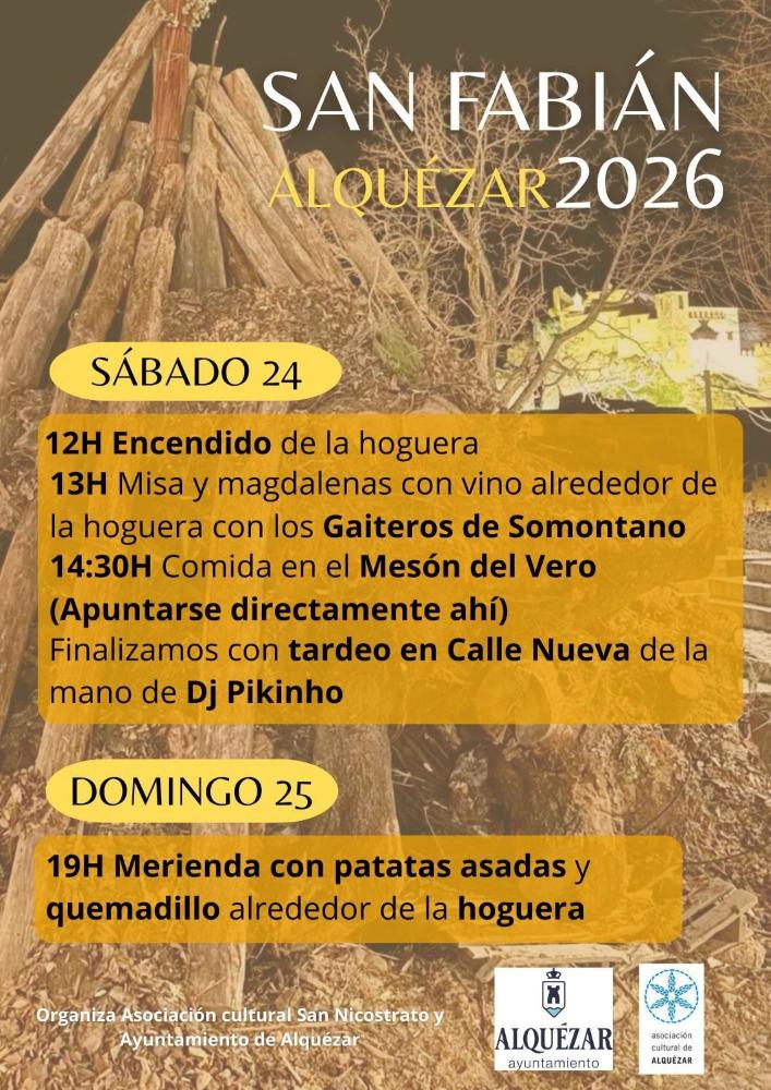 El Ayuntamiento de Alquézar junto con la Asociación Cultural San Nicostrato han preparado un animado y tradicional programa de actos para celebrar y honrar a San Fabián, uno de los santos de la localidad.