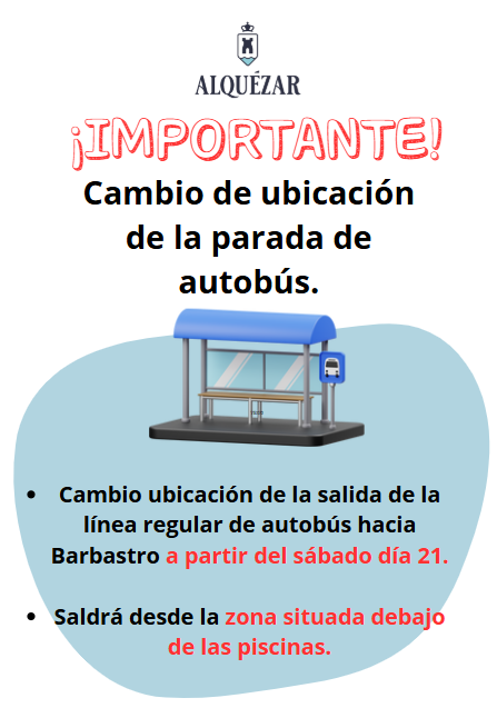 El Ayuntamiento de Alquézar informa a la ciudadanía de que a partir del sábado día 21, entrará en funcionamiento la nueva zona de salida de la línea regular de autobús hacia Barbastro.