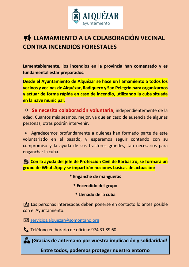 Para ello, "desde el Ayuntamiento de Alquézar se hace un llamamiento a todos los vecinos y vecinas de Alquézar, Radiquero y San Pelegrín para organizarnos y actuar de forma rápida en caso de incendio, utilizando la cuba situada en la nave municipal".