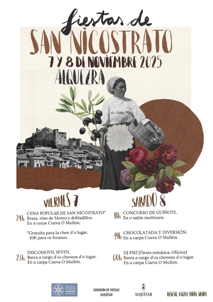 Alquezra vuelve a llenar sus calles de actividad con motivo de la celebración de las Fiestas en honor a San Nicostrato. Así, durante dos días, viernes 7 y sábado 8 de noviembre, tendrán lugar numerosos actos populares que reunirán a vecinos y amigos de la localidad.