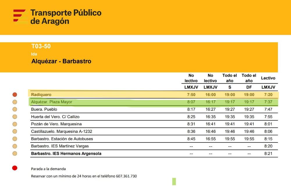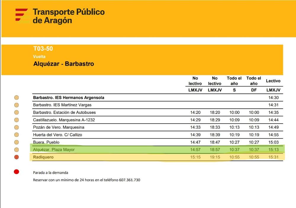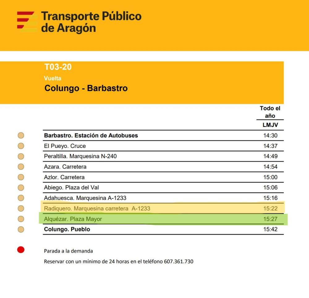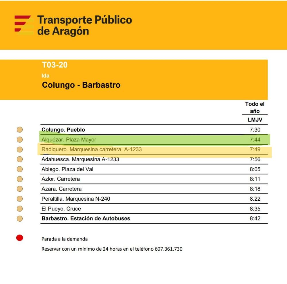 Whatsapp: Nuevos horarios de autobús en Alquézar y Radiquero Fecha 20 abril 2026